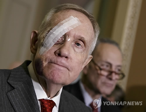 | △ 27일(현지시간) 동영상 메시지를 통해 내년 상원의원 선거 불출마를 선언한 해리 리드(75·네바다) 민주당 상원 원내대표. 지난 1월 초 운동 중 운동기구가 파손되면서 얼굴 오른쪽 눈부위를 다치고 갈비뼈 골절상을 입었다. |