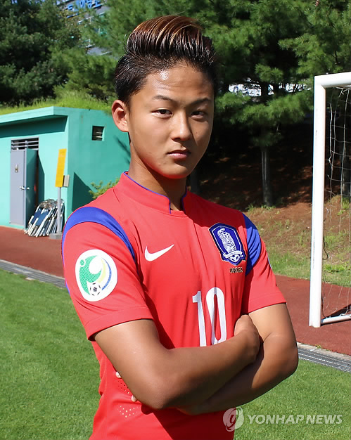 | △ 태극마크 달고 뛰는 바르셀로나 기대주 이승우 (파주=연합뉴스) 장재은 기자 = 28일 파주 NFC(국가대표트레이닝센터)에서 열린 한국 축구 16세 이하 대표팀의 훈련에 참가한 바르셀로나의 기대주 이승우(16). 그는 다음 달 열리는 아시아축구연맹(AFC) 챔피언십에서 득점왕을 노리고 있다. 2014.8.28 jangje@yna.co.kr |