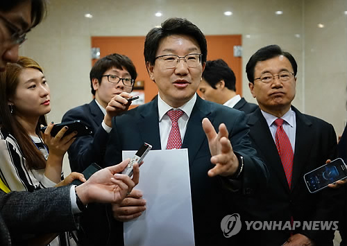 | △ 해외자원개발 국조특위 권성동 간사 기자회견 (서울=연합뉴스) 진성철 기자 = 정부 및 공공기관 등의 해외자원개발 진상규명을 위한 국정조사특별위원회 소속 새누리당 권성동 여당 간사(가운데)와 이현재 의원이 17일 국회 정론관에서 이라크 쿠르드 원전 개발과 관련해 기자회견하고 있다. |