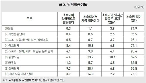 한편 이 조사에서는 모임, 단체에 대한 소속 여부와 활동 정도를 묻는 설문도 있었는데, 정당, 시민운동단체, 노동조합·사업자단체·직업조합의 경우 소속 정도가 낮았으며 소속돼 있더라도 활동이 적극적이지 않은 경우가 많았다.
