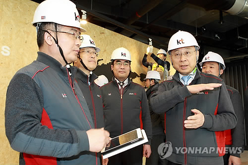 | △ 황창규 KT회장, 경기창조경제혁신센터 공사 현장 방문 (서울=연합뉴스) 황창규 KT 회장이 15일 오전 경기도에 위치한 경기창조경제혁신센터 공사 현장을 찾아 종합적인 운영 계획과 구축 현황을 점검하고 있다. KT와 경기도가 건립중인 경기창조경제혁신센터는 한국형 창조경제 모델의 확산 거점으로 ICT 기술을 활용한 벤처 창업을 지원할 예정이다. 2015.3.15 << KT 제공 >> photo@yna.co.kr |