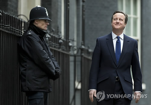 | △ (AP=연합뉴스) 데이비드 캐머런 영국 총리(오른쪽)가 30일(현지시간) 엘리자베스 2세 여왕을 예방하기 위해 런던의 총리 관저를 나서고 있다. 이날 영국에서는 캐머런 총리가 엘리자베스 2세 여왕에게 의회 해산을 공식 청원하고 재가를 얻으며 총선 공식 선거전이 시작됐다. Britain's Prime Minister David Cameron leaves Downing Street to see Queen Elizabeth II for the official dissolution of Parliament, in London, Monday, March 30, 2015. The United Kingdom will go to the polls for a general election on May 7. (AP Photo/Alastair Grant) |