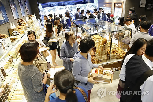 | △ 파리바게뜨 중국 진출 10주년 (서울=연합뉴스) 중국 진출 10주년을 맞아 새로운 콘셉트로 문을 연 파리바게뜨 중국 1호 상하이 구베이점에서 소비자들이 빵을 고르고 있다. 2014.10.12 << SPC 그룹 >> photo@yna.co.kr |