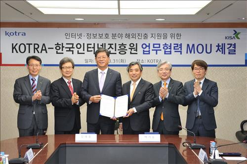 | △ (서울=연합뉴스) 한국인터넷진흥원(KISA)과 대한무역투자진흥공사(KOTRA)이 국내 인터넷·정보보호 분야 산업 해외진출 활성화를 위해 업무협약(MOU)을 체결했다. |