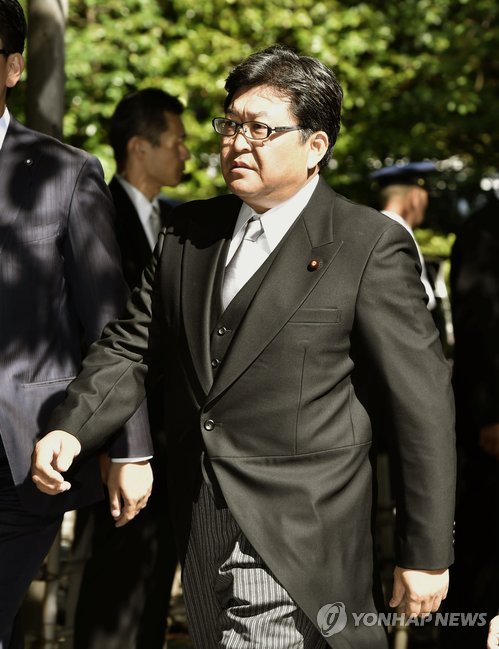 | △ (교도=연합뉴스.자료사진) 아베 신조(安倍晋三) 일본 총리 측근인 하기우다 고이치(萩生田光一) 자민당 총재 특보가 작년 8월15일 아베 총리를 대신해 공물의 일종인 다마구시(玉串·물푸레나무 가지에 흰 종이를 단 것)료를 야스쿠니 신사에 납부 했을 당시 모습. |