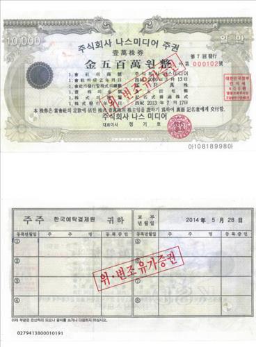 (서울=연합뉴스) 윤선희 기자 = 코스닥 상장사 나스미디어[089600]의 위조 주권이 발견됐다.