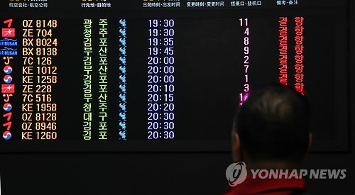 | △ (제주=연합뉴스) 고성식 기자 = 2일 오후 제주에 강풍이 불면서 제주를 오가는 항공기가 무더기 결항한 가운데 제주공항에서 한 승객이 항공기 운항상황판을 바라보고 있다. 2015.04.02 koss@yna.co.kr |