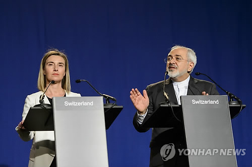 | △ "이란 핵협상 타결됐습니다" (AP/Keystone=연합뉴스) 무함마드 자바드 자리프 이란 외무장관(오른쪽)과 페데리카 모게리니 유럽연합(EU) 외교안보 고위대표가 2일(현지시간) 스위스 로잔에서 공동성명을 통해 이란 핵협상 타결소식을 발표하고 있다. |