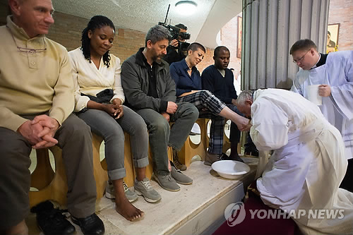 | △ 여죄수 발에 입맞춤하는 프란치스코 교황 (AP/로세르바토레 로마노=연합뉴스) 프란치스코 교황이 2일(현지시간) 이탈리아 로마 외곽 레비비아 교도소를 방문, 한 여자 죄수의 발에 입맞춤하고 있다. 교황은 부활절을 앞두고 이날 교도소를 방문해 재소자 12명과 한 아기의 발을 물로 씻어주었다. 교황은 세족례 후 교황인 자기도 더러움에서 청결해질 수 있도록 기도해 달라고 재소자들에게 부탁했다. |