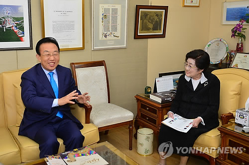 | △ 경북도지사 이희호 여사 만나 남북 문화교류 논의 (대구=연합뉴스) 김관용 경북도지사가 3일 서울 동교동 이희호 여사의 자택을 방문해 이 여사와 지방자치단체 차원의 남북교류 방안 등을 논의하고 있다. 2015.4.3 << 경북도 >> haru@yna.co.kr |
