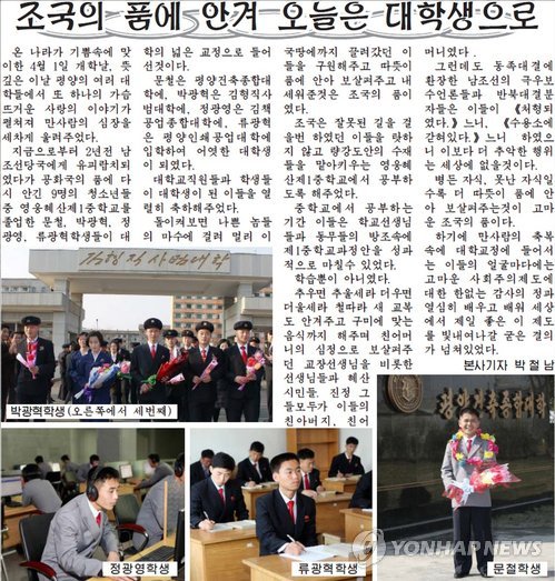 북한의 대외용 주간지 통일신보는 5일 '조국의 품에 안겨 오늘은 대학생으로'라는 제목의 기사에서 2013년 5월 라오스에서 북송된 청소년 9명 중 영웅혜산제1중학교를 졸업한 4명이 대학에 입학했다고 밝혔다.