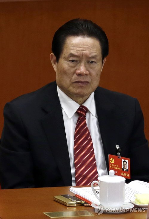 | △ 中 검찰, 저우융캉 전 상무위원 기소 (AP=연합뉴스) 중국 검찰이 부패 혐의로 송치된 저우융캉(周永康) 전 중국 공산당 중앙정치국 상무위원을 3일 정식 기소했다. 중국 톈진(天津)시 인민검찰원은 이날 톈진시 제1중급인민법원에 저우융캉에 대한 공소장을 제출했다. 검찰은 저우의 범죄 혐의로 뇌물수수, 직권남용, 국가기밀 고의 누설 등 3가지를 제시했다. 저우융캉은 후진타오(胡錦濤) 체제에서 최고지도부 일원인 정치국 상무위원과 공안·사법·정보 분야를 총괄하는 당 중앙정법위 서기를 지낸 인물. 사진은 그가 공산당 중앙정치국 상무위원이던 지난 2012년 11월 베이징 인민대회당의 공산당 제 18차 전국대표대회 개막식에 앉아 있는 모습. bulls@yna.co.kr |
