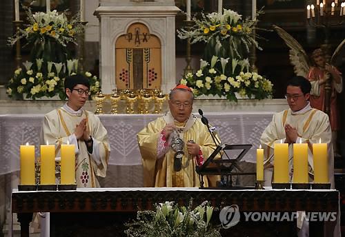 | △ 부활절 미사 (서울=연합뉴스) 박동주 기자 = 부활절인 5일 서울대교구장인 염수정 추기경이 서울 명동성당에서 미사를 집전하고 있다. 2015.4.5 pdj6635@yna.co.kr |