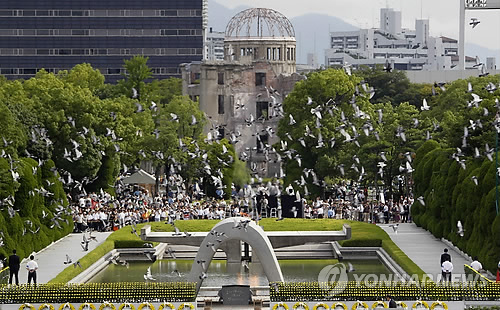| △ 히로시마 평화기념관 위 날아오르는 비둘기 (AP=연합뉴스.자료사진) 히로시마 원폭 돔 Doves fly by the gutted Atomic Bomb Dome, center in background, preserved as a landmark for the tribute to the A-Bomb attack, following a speech delivered by Prime Minister Naoto Kan, marking the 66th anniversary of the world's first atomic bombing, at Hiroshima Peace Memorial Park in Hiroshima, western Japan, Saturday, Aug, 6, 2011. (AP Photo/Koji Sasahara) |