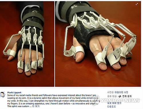 (서울=연합뉴스) 김길원 기자 = 마크 리퍼트 주한 미국대사가 피습으로 부상당한 왼손의 치료 모습을 최근 자신의 페이스북에 공개해 화제가 되고 있다. 일부에서는 리퍼트 대사가 손에 착용한 치료 보조기를 '로봇 손' 같다고 표현했다.