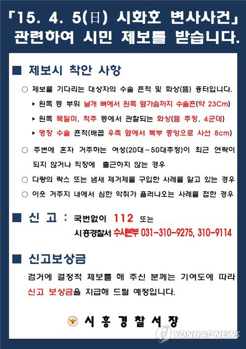 제보전화는 112 또는 시흥서 수사본부(031-310-9275, 9114)로 하면 된다.