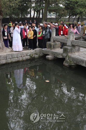 | △ 개성 관광객 10만명 돌파 (개성=연합뉴스) 박지호 기자 = 개성관광객 10만명을 넘어선 15일 오후 황해남도 개성시 선죽교를 찾은 관광객들이 안내원의 설명을 듣고 있다. jihopark@yna.co.kr |