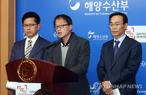 | △ 세월호 유가족-해수부 면담 결과 설명 (세종=연합뉴스) 배재만 기자 = 세월호 유족 법률대리인인 박주민 변호사(가운데)가 6일 오후 정부세종청사 해양수산부 기자실에서 유기준 해수장관과 세월호 유가족 대표단과의 면담 결과를 설명하고 있다. 왼쪽은 해양수산부 연영진 해양정책실장, 오른쪽은 '세월호 선체 처리에 관한 기술검토TF' 단장인 박준권 항만국장. 2015.4.6 scoop@yna.co.kr http://blog.yonhapnews.co.kr/f6464 |