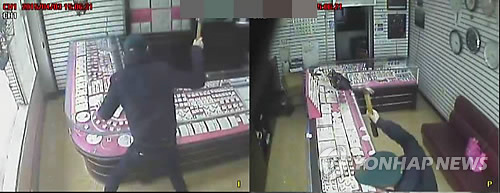 | △ 대낮 금은방 강도 (남양주=연합뉴스) 지난 3일 오후 경기도 남양주시내 한 금은방에서 20대 강도가 망치로 진열장을 부수고 있다. 2015.4.7 <<남양주경찰서>> suki@yna.co.kr |