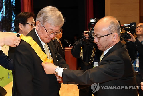 | △ 국민훈장 무궁화장 받는 신영수 WHO 서태평양지역 사무처장 (세종=연합뉴스) 배재만 기자 = 문형표 보건복지부 장관이 보건의 날인 7일 오후 정부세종청사 대강당에서 열린 제43회 보건의 날 기념식에서 신영수 세계보건기구(WHO) 서태평양지역 사무처장에게 보건의료 교육·제도 발전 및 국제 보건향상에 기여한 공로로 국민훈장 무궁화장을 수여하고 있다. |