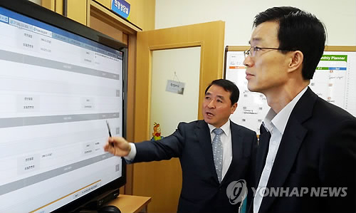 | △ 복지전광판 설명 듣는 기재부 차관 (남양주=연합뉴스) 방문규 기획재정부 2차관이 7일 경기도 남양주시를 방문해 복지 서비스 민·관 통합관리 전산망인 '복지전광판'에 대한 설명을 듣고 있다. 2015.4.7 |