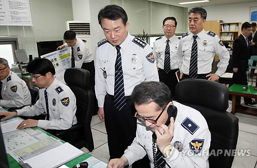 | △ 청주 흥덕경찰서 방문한 강신명 경찰청장 (청주=연합뉴스) 김형우 기자 = 3일 청주 흥덕경찰서를 방문한 강신명(가운데) 경찰청장이 충북지방경찰청이 최초로 실시한 '무선공청시스템' 시연을 살펴보고 있다. 이 시스템을 통하면 강력사건 신고를 접수한 경찰서 상황실에서 단축번호를 누르면, 곧바로 무전기를 휴대한 형사와 112순찰차 등에 실시간으로 신고 내용이 전달된다. 2015.4.3 vodcast@yna.co.kr |