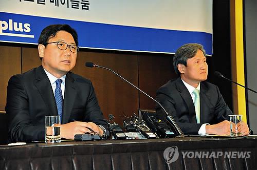 | △ 도성환 홈플러스 사장(왼쪽)과 안희만 부사장이 8일 오전 서울 중구 플라자호텔에서 열린 기자 간담회에서 약 2천개의 가공식품·생필품을 연중 항상 시세보다 10~30% 싸게 팔겠다고 선언했다. |