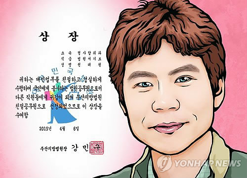 | △ 부산지법 '팝아트 초상' 담은 표창장 (부산=연합뉴스) 부산지방법원이 8일 친절한 직원에게 준 표장장. 일반 상장과 달리 포상자의 초상화가 팝아트 형태로 그려져 있다. 사진은 권태원씨가 받은 상장. 2015. 4.8 << 부산지법 >> osh9981@yna.co.kr |