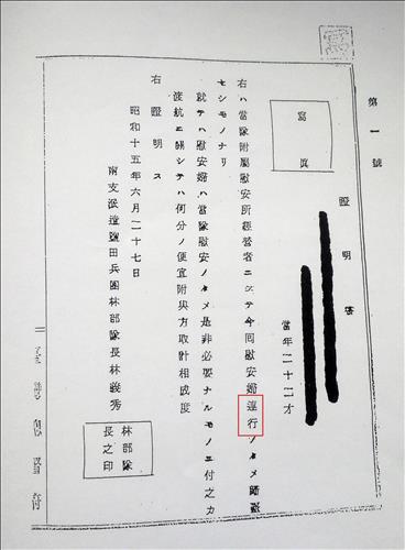 다만 증명서에는 위안부소 관리자의 이름과 주소가 지워져 있어 관리자 누구를 지칭하는지는 알 수 없다. 나이만 22세로 표기돼 있다.