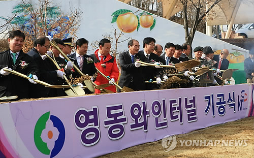 | △ 위치변경 결정된 영동 와인터널 (영동=연합뉴스) 박병기 기자 = 충북 영동군이 용두공원에 조성할 예정이던 와인터널 위치를 레인보우힐링타운으로 변경했다. 사진은 지난해 3월 26일 기공식 장면. <<연합뉴스 DB>> |