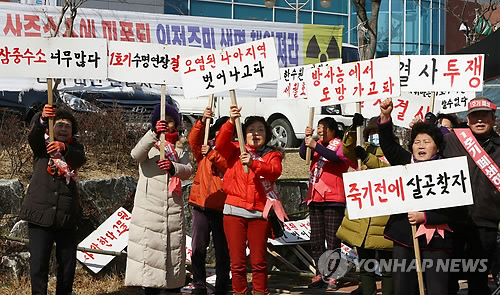 | △ 월성원전 1호기 계속운전 찬반갈등 (경주=연합뉴스) 김준범 기자 = 지난달 27일 경북 경주시 월성원전 홍보관 앞에서 원전 인근 주민들이 1호기 가동에 반대하는 내용의 집회를 열고 있다. 월성원전 1호기의 수명이 2022년까지 연장되자 인근 주민과 환경단체들의 반발이 거세지고 있는 상황이다. 2015.3.9 psykims@yna.co.kr |