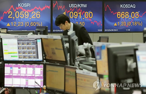 | △ 2,060선에 다가선 코스피 (서울=연합뉴스) 이정훈 기자 = 코스피가 8일 1분기 실적 시즌에 대한 기대감으로 2,060선 고지에 바짝 다가섰다. 이날 서울 중구 명동 외환은행 본점 딜링룸. |