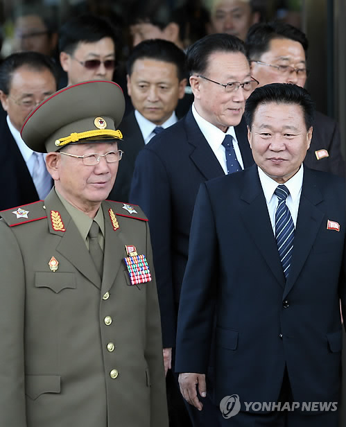 | △ 지난해 10월 인천 인천 아시안게임 폐막식에 참석한 황병서 총정치국장(왼쪽), 최룡해(오른쪽), 김양건(가운데) 대남담당 비서.(연합뉴스 자료사진) |