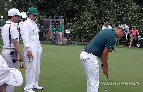 배용준은 마스터스 1라운드를 하루 앞둔 8일(현지시간) 오후 열린 파 3 콘테스트에서 배상문의 캐디로 나서 호흡을 맞췄다.