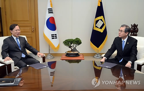 | △ 정재찬 공정거래위원장, 박병대 법원행정처장 예방 (서울=연합뉴스) 정재찬 공정거래위원장(오른쪽)이 9일 서울 대법원을 방문해 박병대 법원행정처장(왼쪽)과 대화하고 있다. (공정거래위원회 제공) |