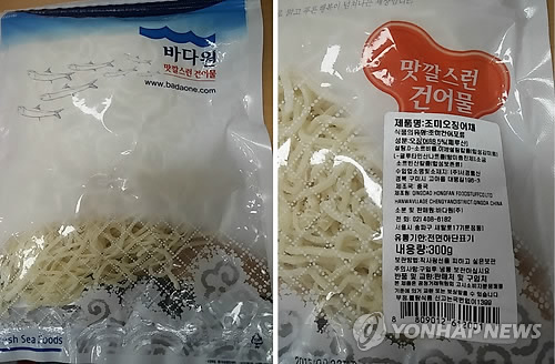 | △ 식중독균 검출 조미건어포류 회수 조치 (서울=연합뉴스) 식품의약품안전처는 식품소분업체 바다원(주)이 소분한 '조미오징어채' 제품에서 식중독균인 황색포도상구균이 기준 초과 검출돼 판매중단 및 회수 조치한다고 9일 밝혔다. 회수 대상은 유통기한이 2015년 9월 22일인 제품이다. (식품의약품안전처 제공) |