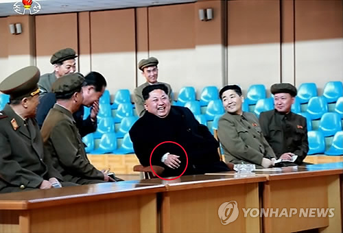| △ 북한 김정은, 오른 손목에 부상…거즈와 반창고 붙여 (서울=연합뉴스) 평양약전기계공장을 현지지도 하면서 간부들과 대화하는 김정은 제1위원장의 코트 오른 팔 소매 밑으로 반창고를 붙인 모습이 포착됐다. |