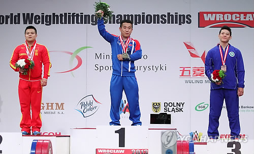 | △ 북한 역도 엄윤철(가운데)이 2013년 10월 폴란드에서 열린 세계역도선수권대회 남자 56 kg급 경기에서 금메달을 딴 뒤 시상대에 올라 있다. <<연합뉴스DB>> |