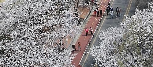 | △ 벚꽃축제를 앞둔 8일 오후 벚꽃이 만개한 서울 여의도 윤중로를 시민들이 걷고 있다. 2015.4.8 |