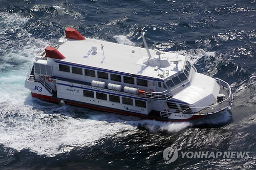 (부산=연합뉴스) 차근호 기자 = 10일 오전 10시 12분께 부산에서 일본 후쿠오카로 향하던 국제여객선 코비 3호가 태종대에서 남동쪽으로 25km(14마일) 떨어진 해상에서 돌고래로 추정되는 물체에 부딪히면서 엔진고장으로 표류하고 있다.