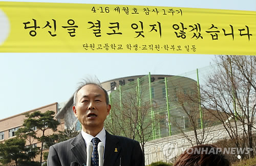 | △ 세월호 생존 학생 면담한 이석태 특조 위원장 (안산=연합뉴스) 신영근 기자 = 10일 오후 경기도 안산 단원고등학교에서 세월호 생존 학생들을 면담한 4·16 세월호 참사 특별조사위원회 이석태 위원장이 취재진에게 면담 내용에 대해 이야기하고 있다. 2015.4.10 drops@yna.co.kr |
