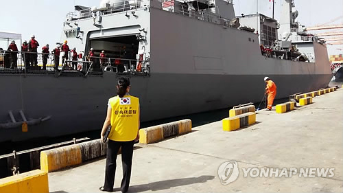 | △ 예멘 체류 국민 철수, 오만 살랄라항 도착 (서울=연합뉴스) 예멘에 체류하던 우리 국민 6명이 청해부대 왕건함을 통해 10일 오만 살랄라항에 도착했다고 외교부가 밝혔다. 사진은 항구에 도착한 왕건함 모습. (외교부 제공) |