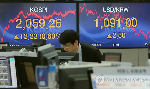 코스피는 지난 8일 심리적 저항선으로 여겨지던 2,050선을 넘어선 데 이어 10일 에는 2,087.76으로 마감, 작년 고점까지 돌파했다.