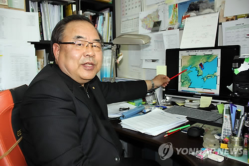 | △ 윤성효 부산대 교수 "백두산 화산 활성화 조짐 뚜렷" (부산=연합뉴스) 민영규 기자 = 윤성효 부산대 지구과학교육과 교수가 12일 연구실에서 백두산 화산의 최근 동향을 설명하고 있다. |