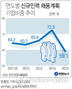 설문조사에서 올해 신규인력 채용 계획이 있거나 이미 채용했다고 답한 기업은 59.1%에 그쳐 최근 5년 내 가장 낮은 수치를 기록했다. 2011년에는 기업들의 64.2%, 2012년 63.2%, 2013년 65.8%, 2014년 72.3%가 같은 답을 한 바 있다.