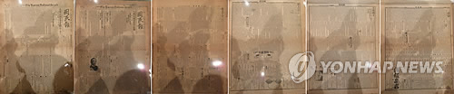 | △ 보훈처, '임시정부 공보·구미위원부통신' 결호 발굴 (서울=연합뉴스) 국가보훈처는 그간 국내에 알려지지 않았던 '대한민국임시정부 공보(22·26·27호)'와 '구미위원부통신(31·35·44·46호)'를 발굴해 공개한다고 밝혔다. 사진은 대한민국 임시정부 공보(왼쪽에서 세 번째까지)와 구미위원부통신(왼쪽에서 네 번째부터 여섯번 째).2015.4.12 << 국가보훈처제공 >> hkmpooh@yna.co.kr |