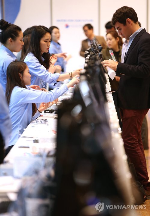 | △ '세계물포럼을 위해 왔습니다' (대구=연합뉴스) 한종찬 기자 = 2015 대구·경북 세계물포럼 개막을 하루 앞둔 11일 오전 대구 패션센터에서 외국인 참가자들이 사전 등록을 하고 있다. 오는 12일부터 6일 동안 대구·경북에서 열리는 세계물포럼엔 세계 170여개국 정부·기업·학계 관계자 등이 참여한다. 2015.4.11 saba@yna.co.kr |