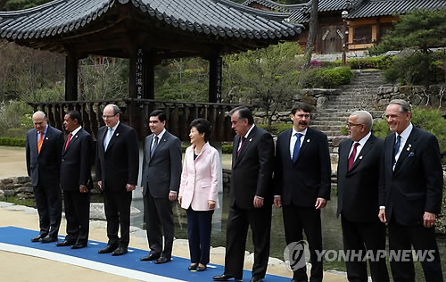 | △ 제7차 세계 물포럼 환영오찬서 기념촬영 (대구=연합뉴스) 도광환 기자 = 박근혜 대통령이 12일 오후 대구 계명대학교에서 열린 제7차 셰계물포럼 환영오찬에서 오찬을 마친 뒤 주요 참석자들과 기념촬영하고 있다.왼쪽부터 호세 앙겔 구리아 OECD 사무총장, 물라투 테시호메 위르쿠 에티오피아 대통령, 알베르 2세 모나코 대공, 구르반굴리 베르디무하메도프 투르크메니스탄 대통령, 박 대통령, 에모말리 라흐몬 타지키스탄 대통령, 야노슈 아데르 헝가리 대통령, 압데리라 벤키란 모로코 총리, 얀 엘리아슨 유엔 사무부총장. |