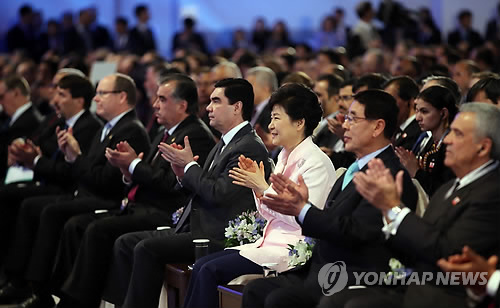 앞서 박 대통령은 낮 12시부터 구르반굴리 베르디무하메도프 투르크메니스탄 대통령, 에모말리 라흐몬 타지키스탄 대통령, 알베르 2세 모나코 대공, 야노쉬 아데르 헝가리 대통령, 물라투 테쇼메 에티오피아 대통령, 앙헬 구리아 경제협력개발기구(OECD) 사무총장, 얀 엘리아슨 유엔 사무부총장 등과 계명대학교 한학촌에서 환영 오찬을 했다.