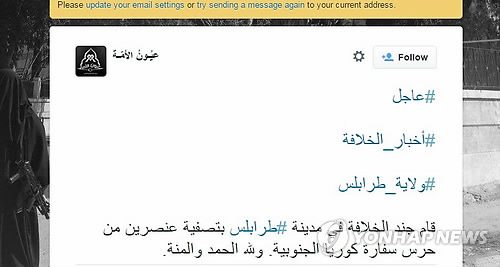| △ IS연계 무장조직 주리비아 한국대사관 공격 주장 (두바이=연합뉴스) 강훈상 특파원 = 수니파 무장조직 '이슬람국가'(IS)를 추종하는 트위터 계정을 통해 12일 오전 10시께(한국시간) 리비아 트리폴리 주재 한국대사관 공격을 주장하는 글이 게시됐다. 이 글은 '긴급, 칼리파(IS)의 트리폴리 병사들이 한국대사관 경비 2명을 사살했다. 알라를 찬양한다'는 내용이다. 2015,4.12 <<트위터 캡처>> hskang@yna.co.kr |
